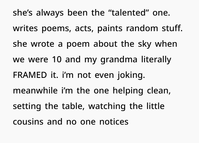 Growing up side by side, I was always taught to defer to her: “Let her have it, make her happy, don’t rock the boat.” Meanwhile, I cleaned, helped, did all the behind‑the‑scenes work. But no one seemed to notice me. So over time I swallowed the hurt. But tonight it all burst. And I wonder — was I unreasonable? Or was I finally standing for myself?