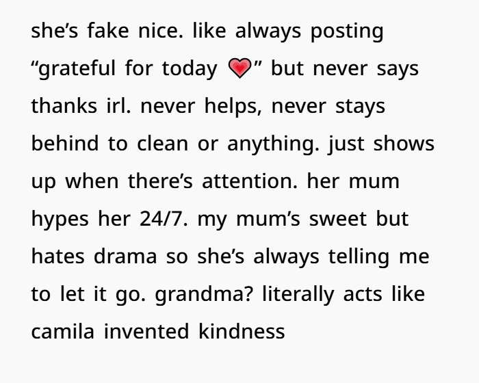 Camila might be seeking affirmation — “You see me, I’m worthy, I matter” — through performance and ceremonies. That doesn’t automatically make her mean. But when her methods override others’ feelings — like hers overwriting your celebration — it becomes toxic.