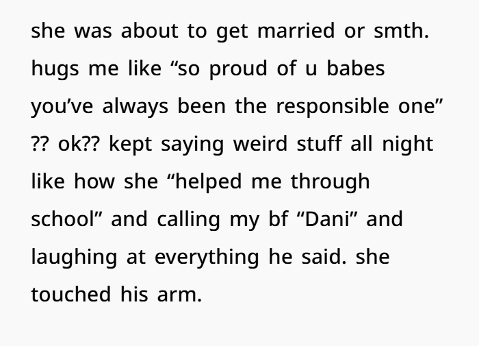 So tonight, when she read a poem — maybe it was genuinely something she felt — but in your context it read like the same old script: she turns occasions into stages, making it about her when it’s supposed to be someone else’s.