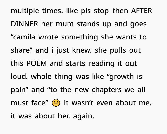 When she got up and read that poem (about “growth,” “new chapters”) in your dinner, in front of your family, you realized: she was making it about her again, turning your win into her stage. That triggered all the old hurts: “Let it go, don’t complain, don’t demand your day.” And you snapped.