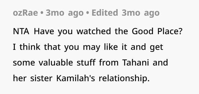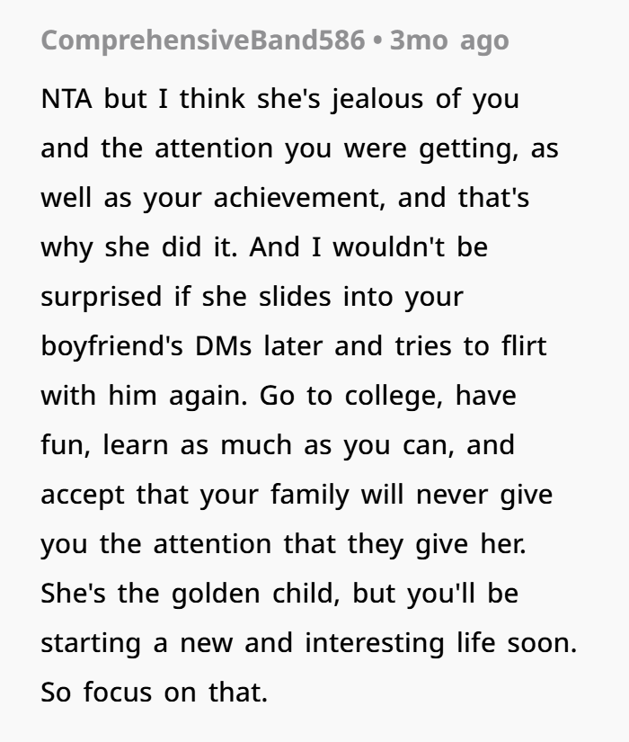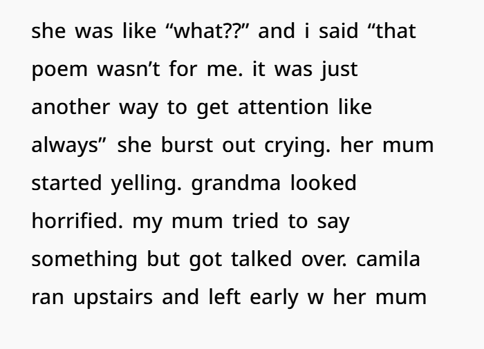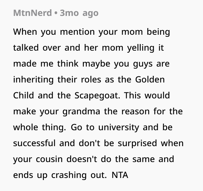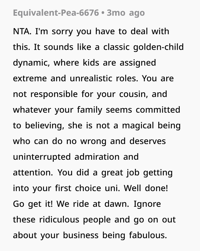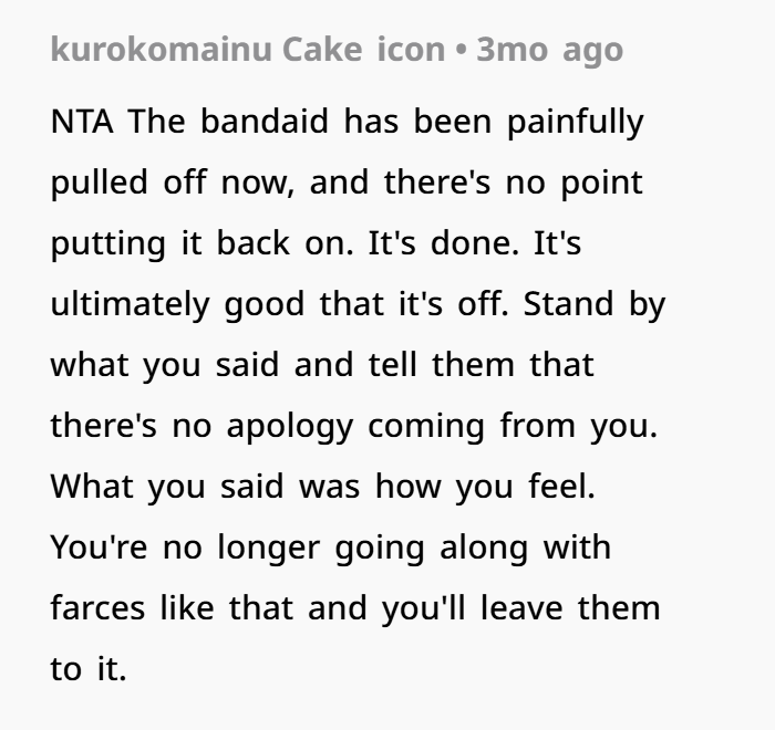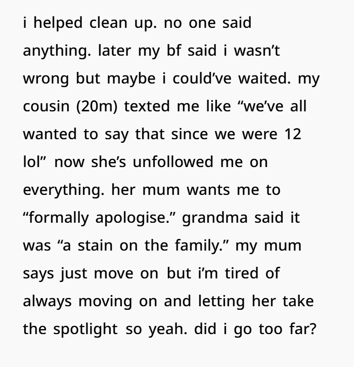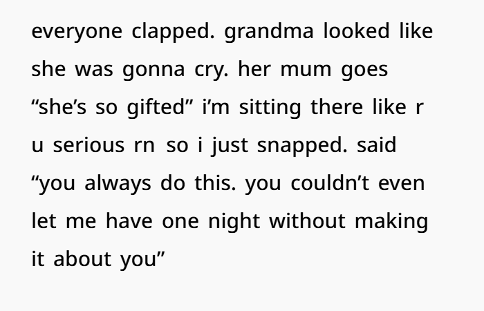 You might’ve hurt her feelings, yes. But this confrontation also calls into question the family’s pattern: Who deserves to be seen? Whose achievements are valid? You shook the foundation.