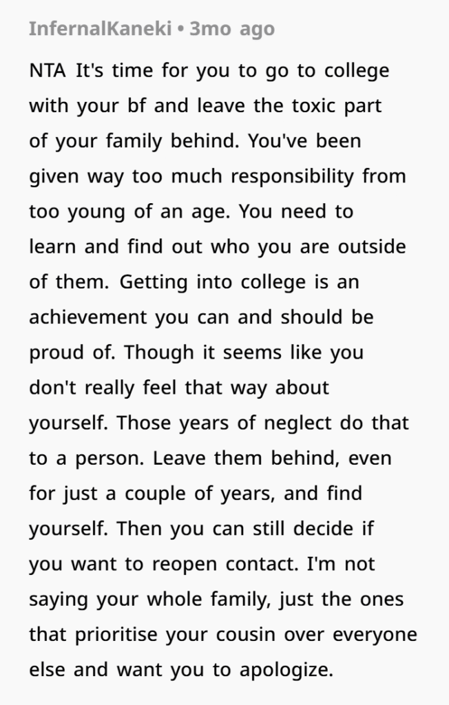 Many commenters sided with the author, urging her to go on living her life and stop thinking about her cousin