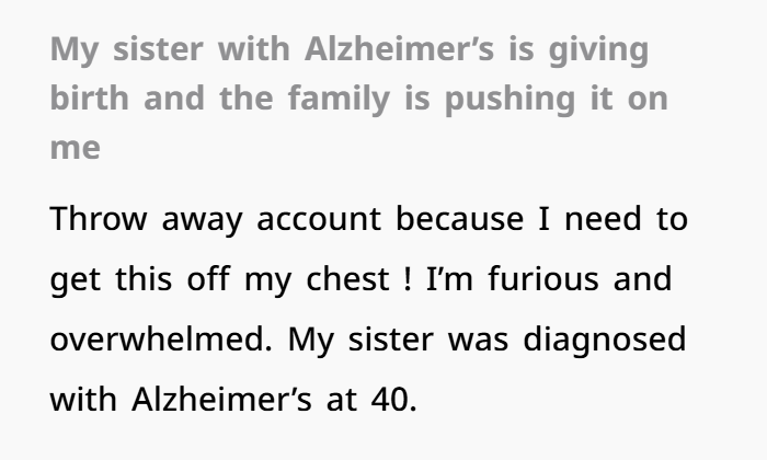 When love and family collide with reality, the fallout can be heartbreaking—and in this case, infuriating. A woman is at her limit after learning her sister, who was diagnosed with early-onset Alzheimer’s at just 40, is about to give birth. The baby’s father? Gone. The plan for the future? Non-existent. And now? The family’s turning to the one person who made it clear—she doesn’t want kids.