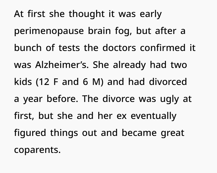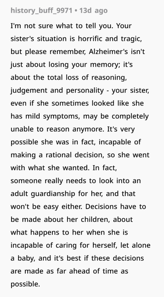 So when the OP’s sister got her diagnosis at 40, the clock started ticking. Not just on her memories—but on her independence, her ability to parent, and her decision-making capacity.