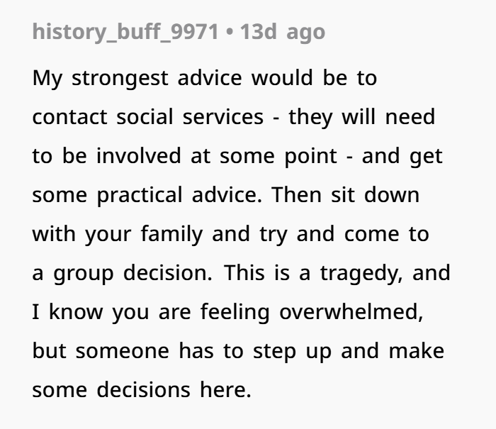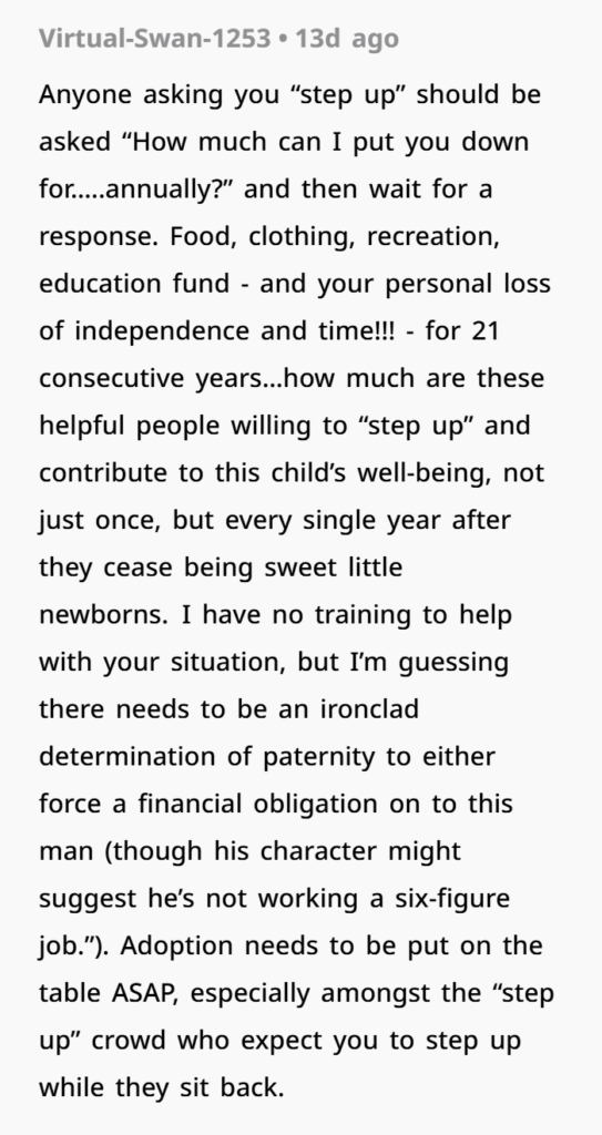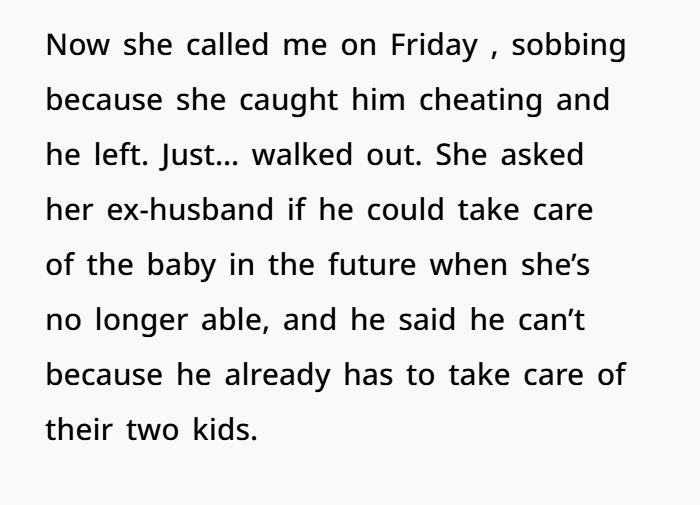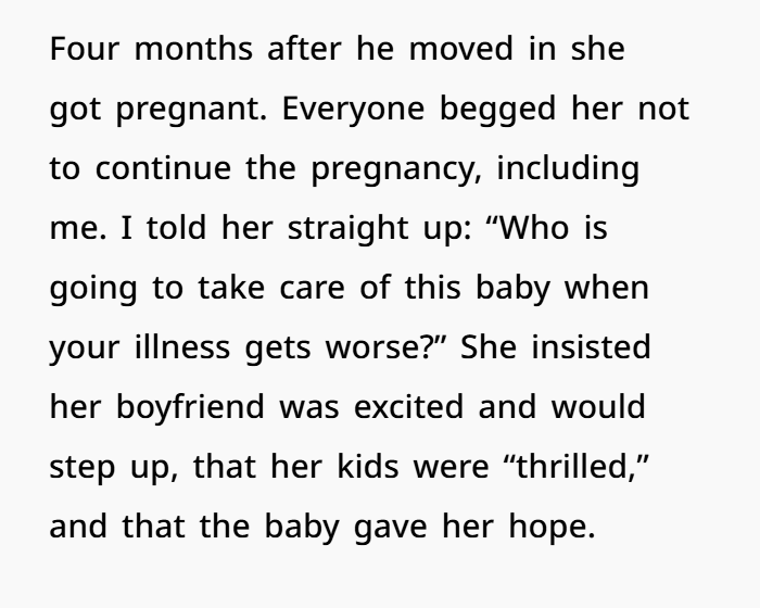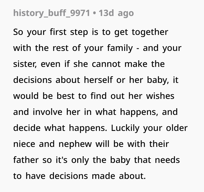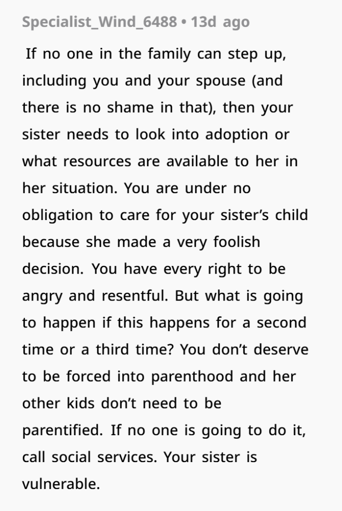 The older kids (12F and 6M) are already being set up to “parent” this new baby. That’s not fair. They need therapy. They need clarity. And they need someone to step in before they’re thrown into parenthood at 13.
