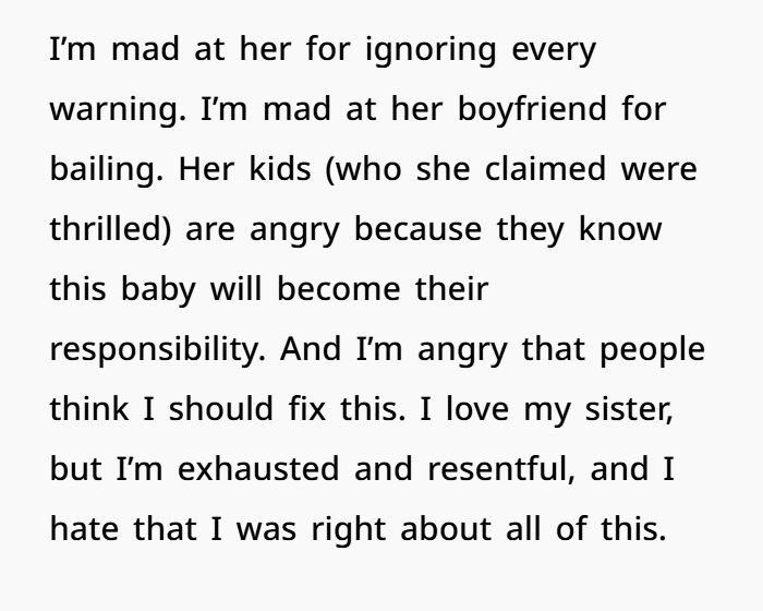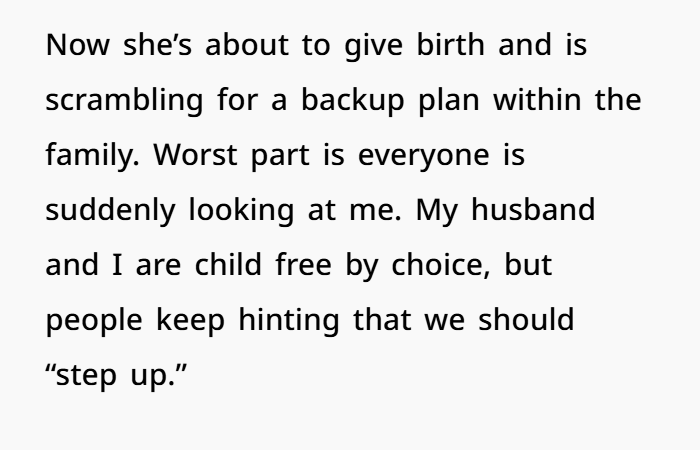 This Reddit post captures the complicated, raw emotions that come when family expectations start drowning out individual boundaries. The OP (original poster) is child-free by choice, emotionally and mentally overwhelmed, and now being quietly pressured into stepping up for a decision she never made. And worst of all—she saw it all coming.