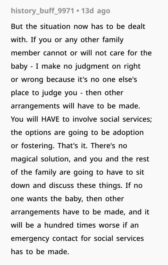 The baby will need a guardian. If the family isn’t stepping up, now’s the time to call in social services, guardianship agencies, or even foster care planning. It’s not cold—it’s practical.