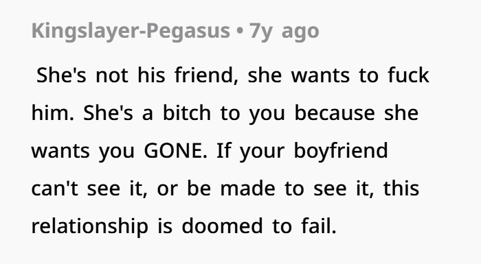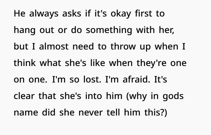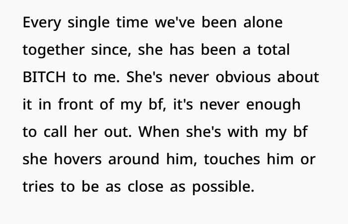 From the very beginning, something felt off. Sweet and bubbly in front of him, cold and hostile the moment they were alone. It wasn’t obvious enough to call out, but it was consistent enough to feel intentional. Over time, the behavior escalated—touching, cuddling, bringing up past intimacy, and now crossing physical lines right in front of her. A kiss on the neck. Constant closeness. Subtle digs that couldn’t be proven. And the worst part? The boyfriend doesn’t fully see it. Or maybe doesn’t want to. Now she’s stuck in a situation where reacting makes her look insecure, staying quiet makes her feel disrespected, and walking away feels like losing something good because of someone else’s interference.