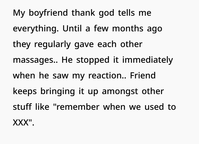 There’s also the physical boundary issue, which is way more serious than it might seem at first. Hugging from behind, kissing his neck, cuddling, “accidental” exposure—none of that falls under normal friendship behavior, especially when one person is in a committed relationship. Research in relationship psychology shows that physical intimacy outside a relationship—even if labeled as “friendly”—can blur emotional lines and create attachment confusion. It’s one of the most common ways emotional cheating begins.