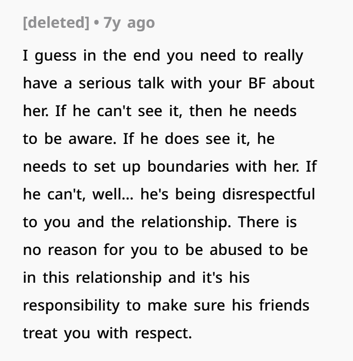 First, you need to shift the focus slightly. Right now, it feels like the problem is her. And yes, she’s behaving badly. But the real issue in your relationship is what your boyfriend allows.