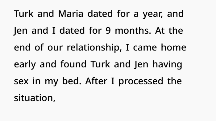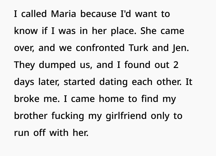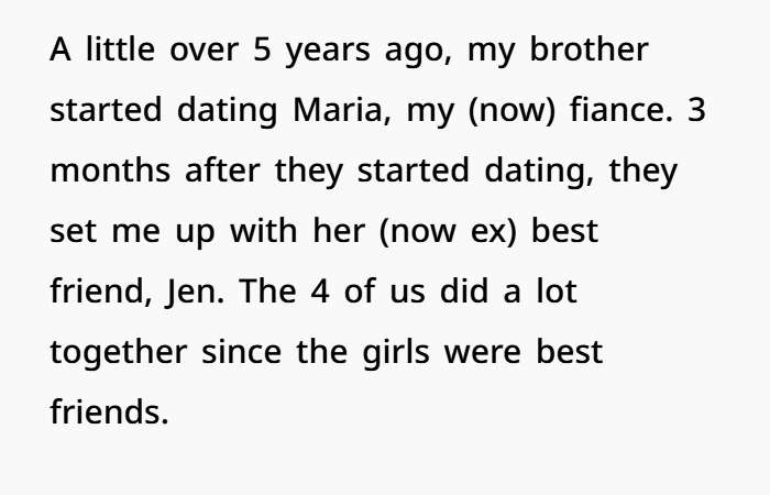 So here’s the mess. The kind that doesn’t just sting for a while — it sticks. Five years back, what started as a normal double-dating situation between two couples turned into full-blown betrayal. The narrator’s brother ended up sleeping with his girlfriend, in his own bed, no less. And instead of remorse or even basic decency, the brother ran off and started dating her right after. That kind of thing doesn’t just break trust — it shatters family ties too. The fallout pushed the narrator back into his parents’ home, while they weirdly brushed off the betrayal like it wasn’t that big of a deal. Meanwhile, the narrator and his now-fiancée bonded over shared heartbreak and slowly built something real out of that chaos.