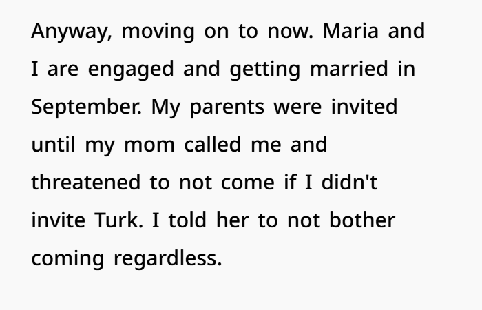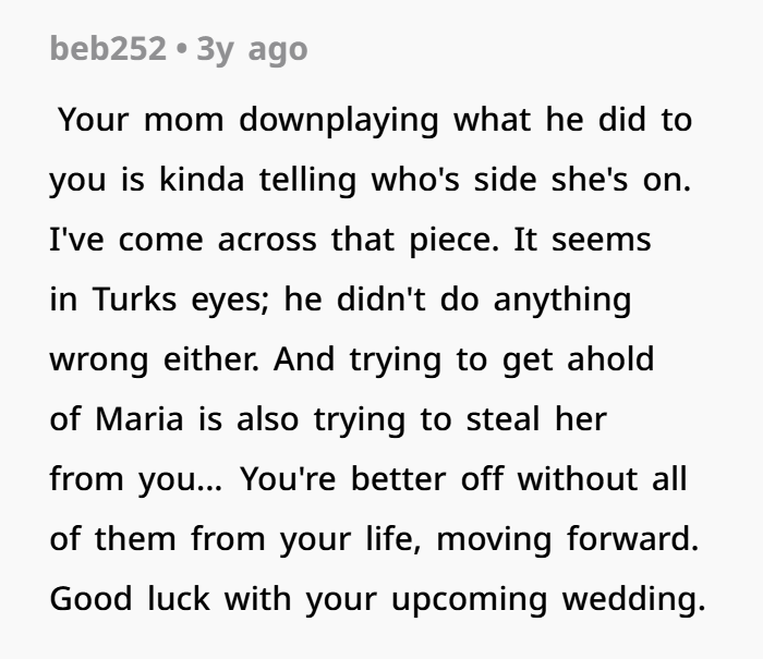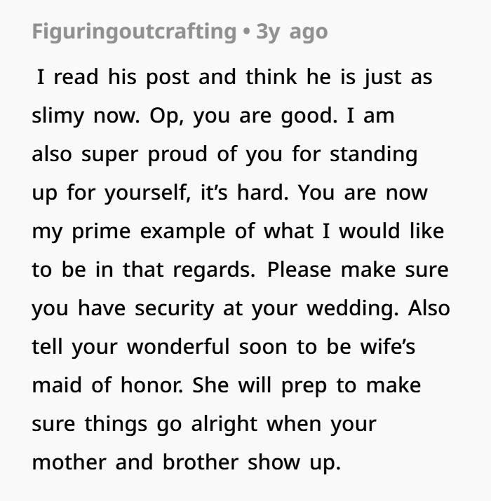 Fast forward to today, things were finally looking stable. He’s engaged, planning a wedding, moving on. But then the past comes knocking. His mom basically issues an ultimatum — invite the brother who betrayed you, or don’t expect her to come. And just like that, the wound reopens. The brother, who hasn’t spoken to him in four years, suddenly shows up begging for an invite like nothing ever happened. Now it’s not just about a wedding guest list. It’s about boundaries, respect, and whether “family” should always get a free pass — even after they’ve done something unforgivable.