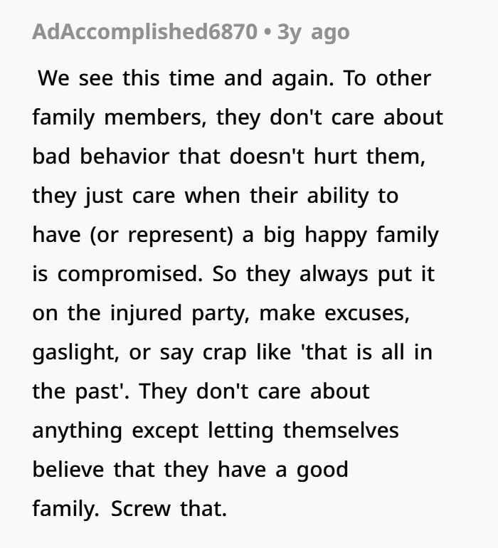 A lot of families fall into this pattern where they push for “keeping the peace” instead of addressing wrongdoing. It’s super common in toxic or emotionally imbalanced family systems.