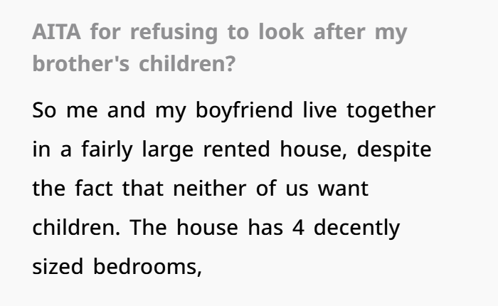 This story starts with an emergency—but turns into a full-blown family conflict when one sister refuses to take on a role she never signed up for. OP (Original Poster) and her boyfriend live a childfree life with their pets, enjoying a spacious home and a schedule that doesn’t include babysitting. So when OP’s brother called to say his wife had broken her leg and they needed someone to watch the kids immediately, she was caught off guard. Before she could even say yes or no, he showed up at her house, dropped off his two kids, and left.