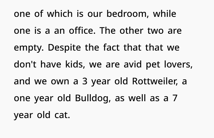 OP clearly states she doesn’t want children, and her lifestyle reflects that. She and her partner planned their day with their pets in mind, which is completely valid for people who prioritize animal companionship over traditional parenting.