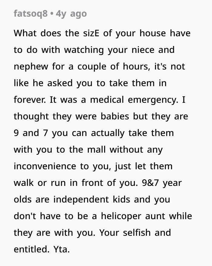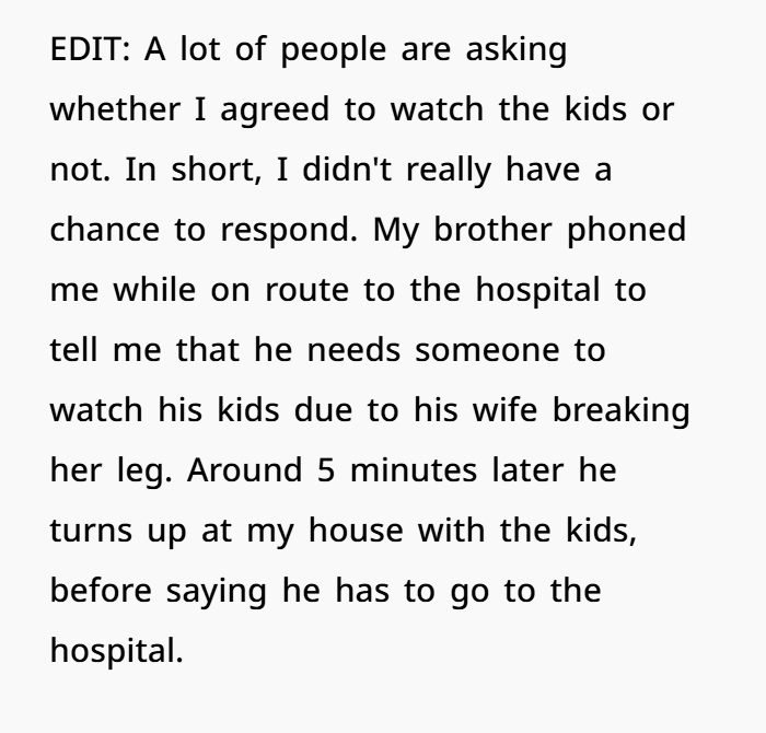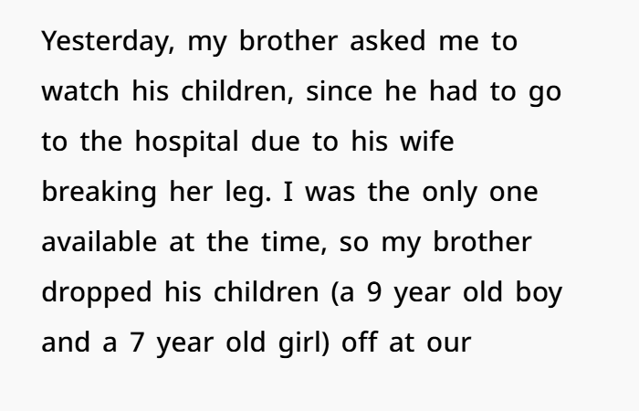 The poster’s brother left his 2 kids with her, as his wife broke her leg and he had to take her to the hospital, but this irked her