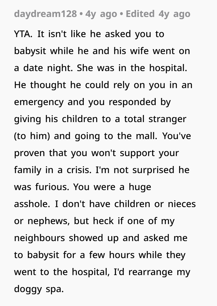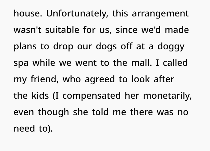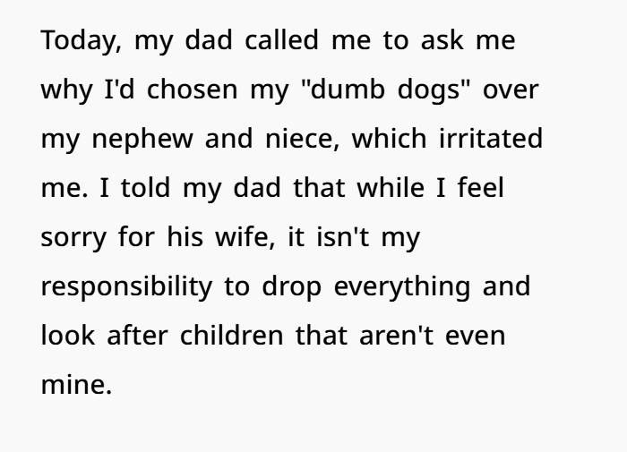 The timing couldn’t have been worse. OP had made plans with her boyfriend to take their dogs to a spa and head to the mall. Not wanting to cancel their day, she found a trusted friend willing to watch the kids instead—and even paid her for the favor. But when her brother found out his children were with someone he didn’t know, he hit the roof. Now, the family’s in full drama mode, her dad’s calling her selfish, and OP’s left wondering if she’s the jerk for choosing her “dumb dogs” (as her dad put it) over her nieces and nephews.