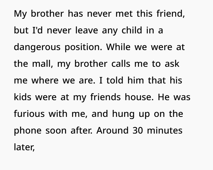 That’s why the fact that the kids were with someone the brother didn’t know was such a sticking point. He didn’t know her, therefore it wasn’t acceptable—even though his sister trusted her.