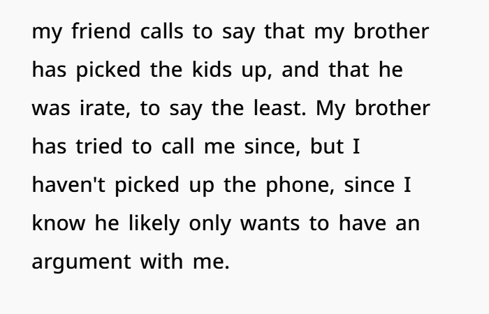 OP never actually agreed to take care of the kids. She didn’t say no, but she didn’t say yes either. Her brother took that silence and used it to justify his decision to dump responsibility on her without warning. That’s not an ask. That’s a boundary violation.