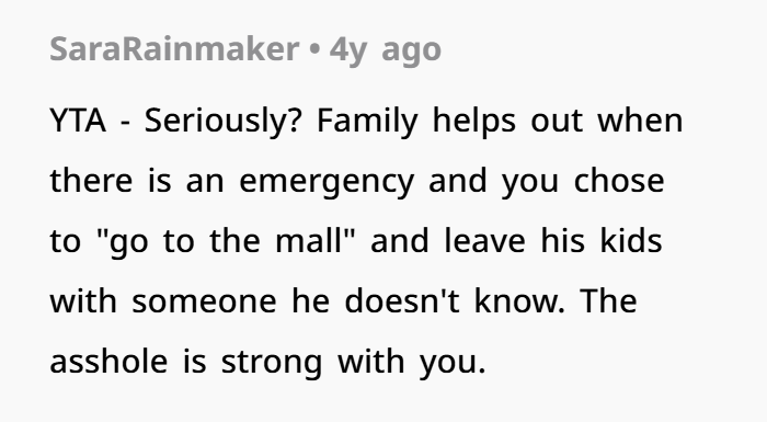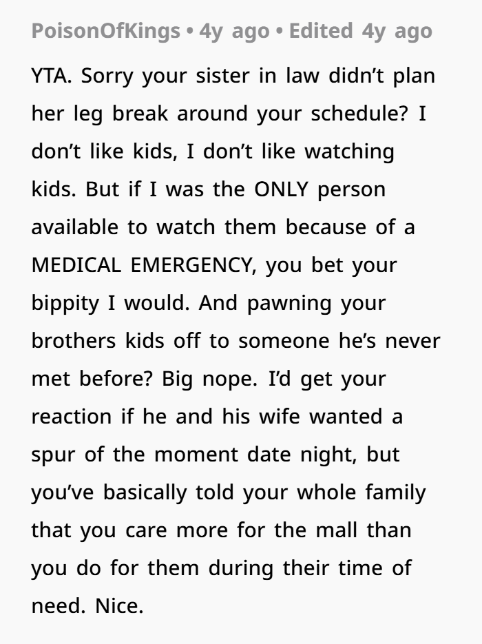 And for her brother to blow up instead of being grateful that his kids weren’t just left on a doorstep? That says more about him than it does about her.