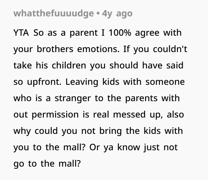 At the core of this story is control. OP’s brother and father aren’t angry because the kids weren’t safe. They’re angry because they weren’t the ones making the decisions.