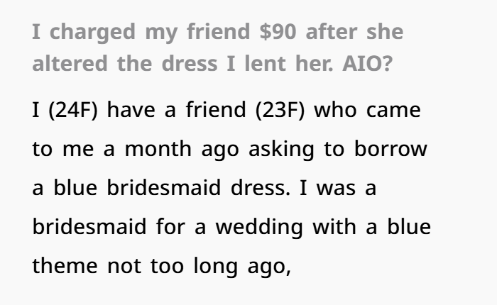 I (24F) lent a blue bridesmaid dress to a friend (23F) for a wedding. Seemed harmless — I trusted her, thought it was a friendly favor. But when she returned it, the dress had been altered to fit her snugly. She never asked me first.
