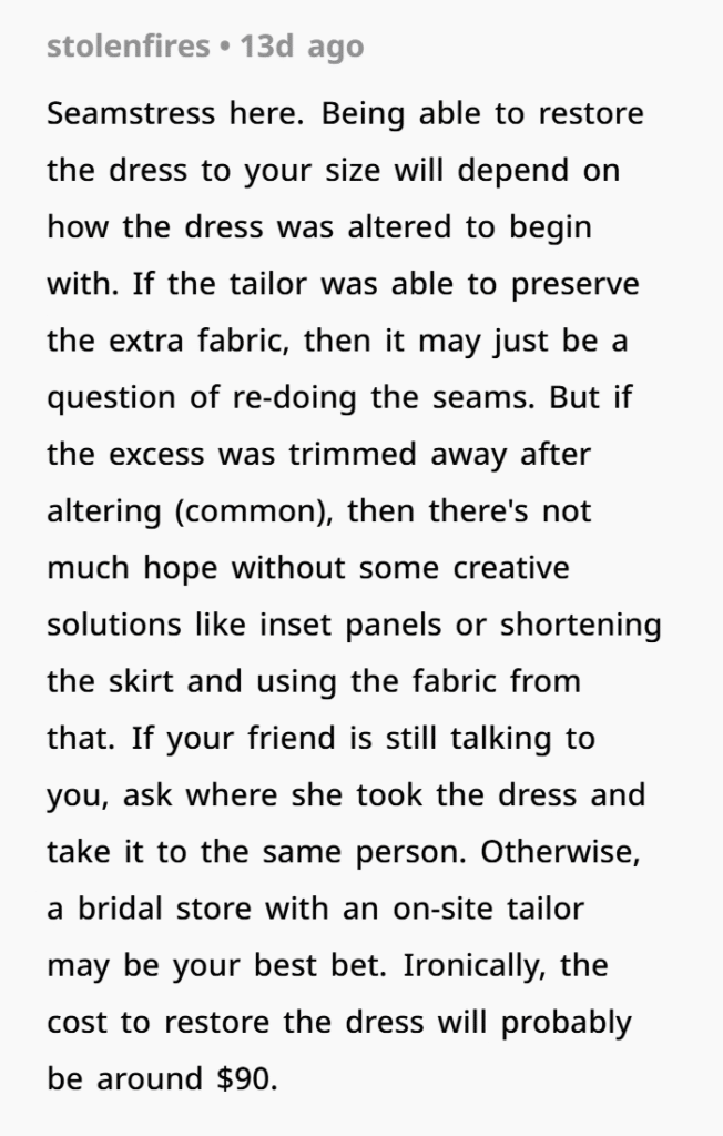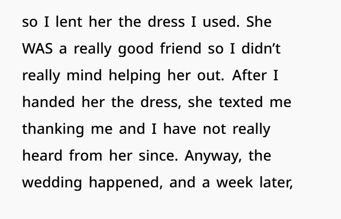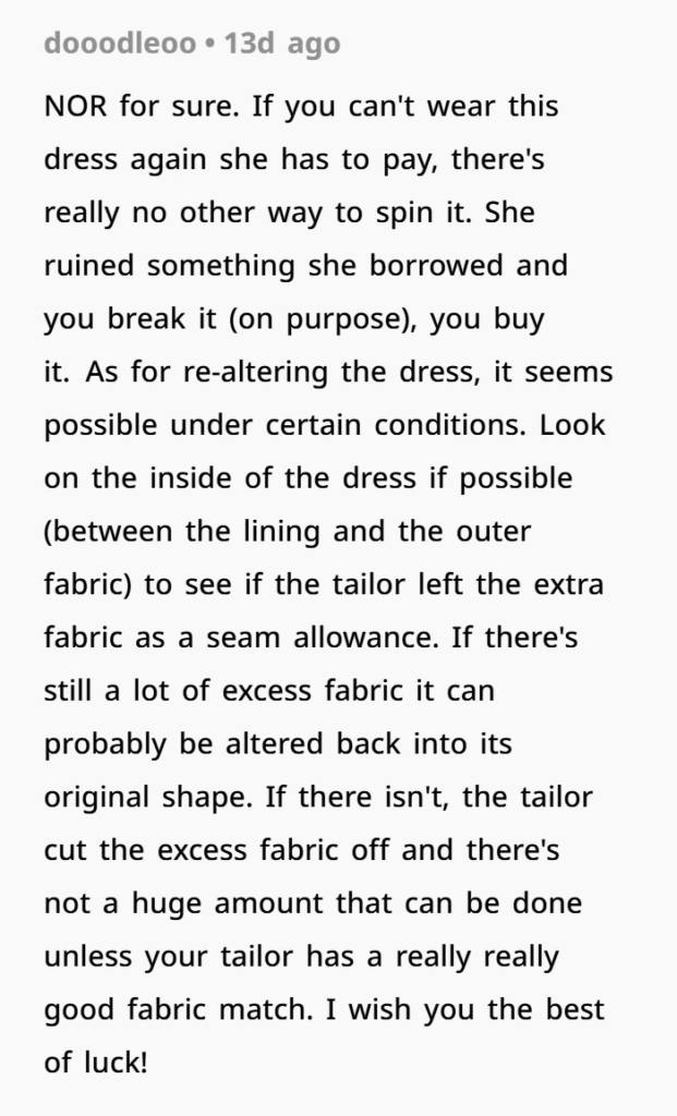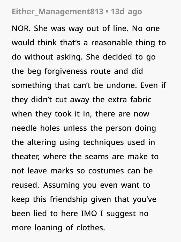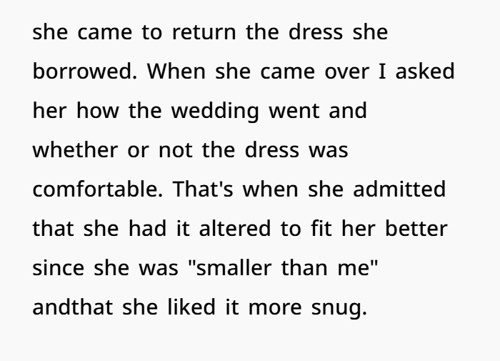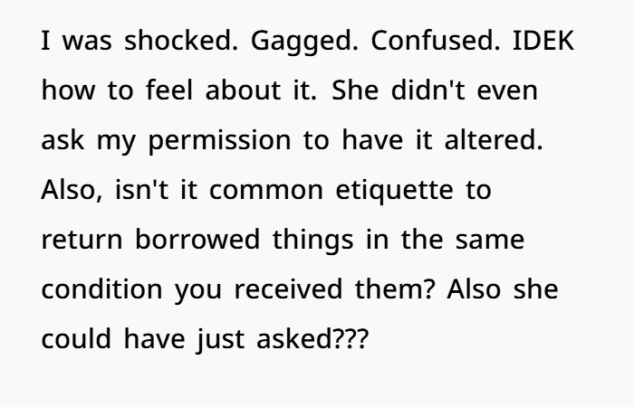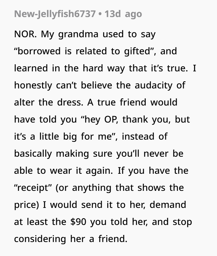In short — your friend didn’t treat that dress like a loan. She treated it like a gift she could customize.