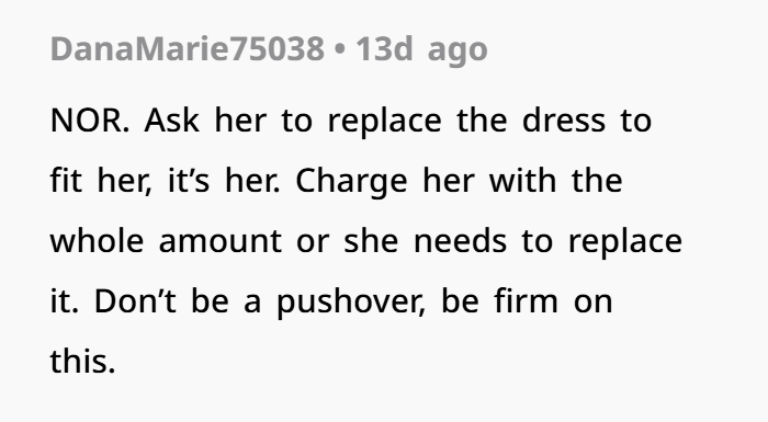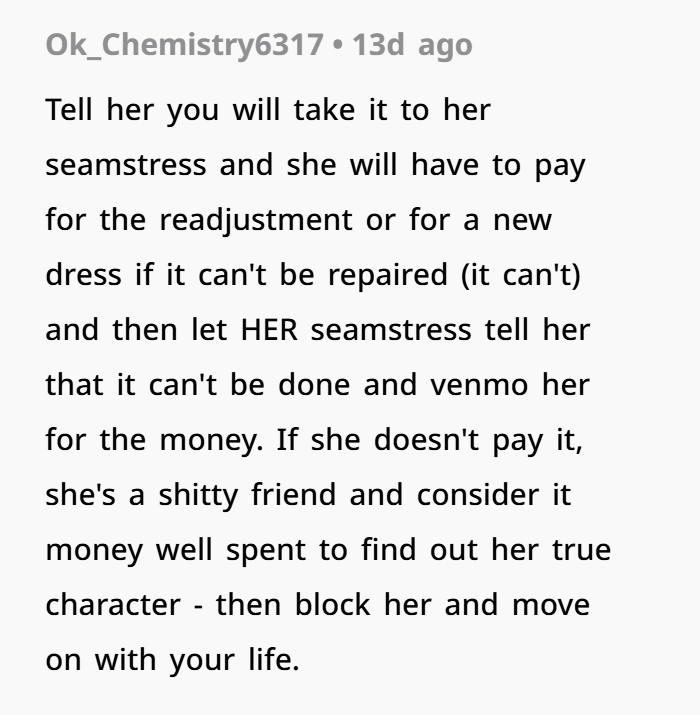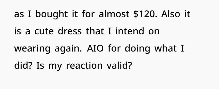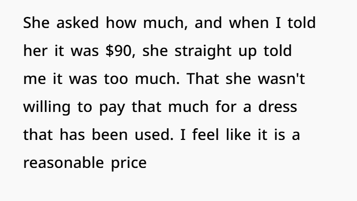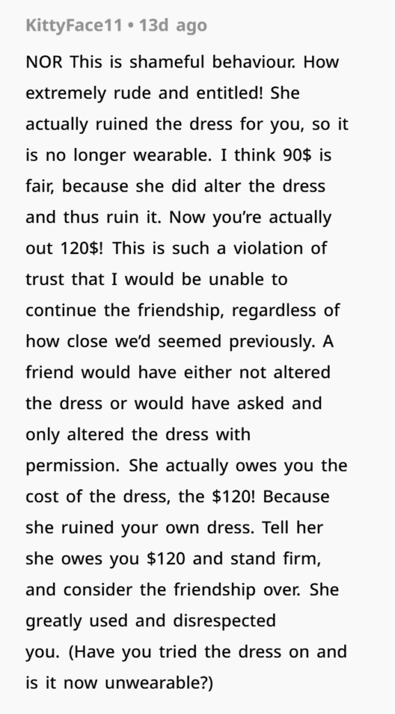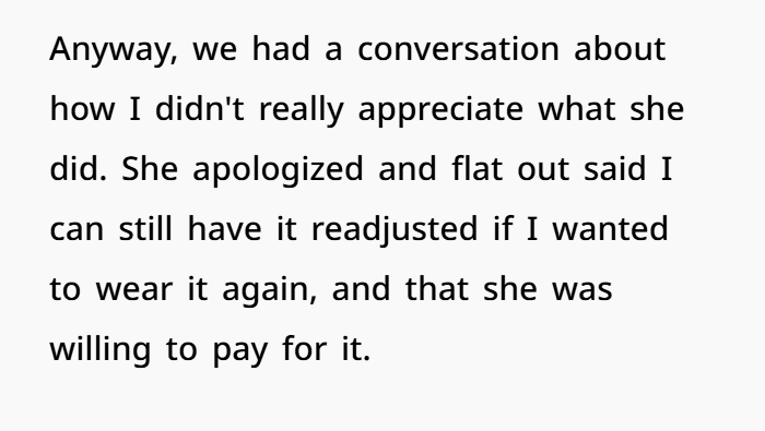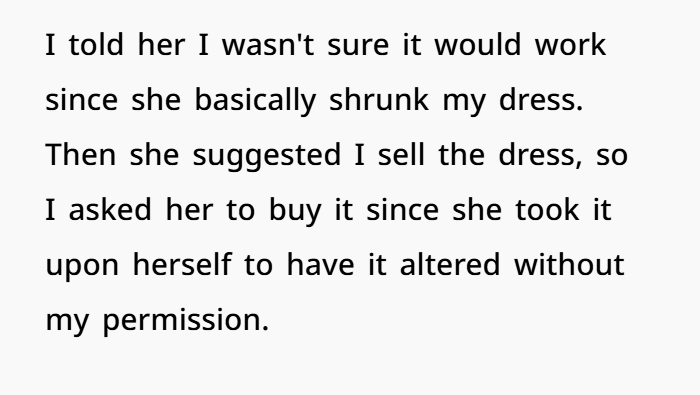I felt gutted. The dress was mine, purchased for nearly $120, and I’d planned to wear it again. She was unapologetic at first, but then offered to pay or let me adjust it back. Instead, I asked her to buy it for $90 since she made the changes without permission. She refused, saying it was “just used.” I felt that was unfair.