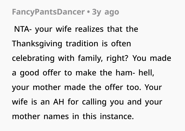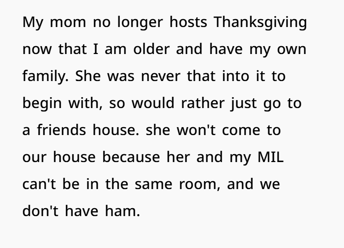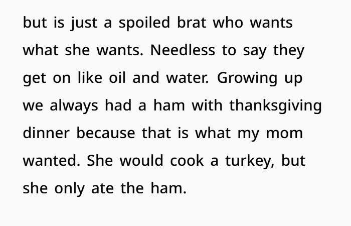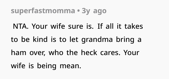 So now, I’m left wondering: AITA for going ahead and cooking the ham myself, even though my wife didn’t want it? I’m not trying to start a fight, but I feel like I’m caught between two women who just can’t get along. Should I have just let it go and accepted no ham? Or was I right to cook it the way I wanted to?