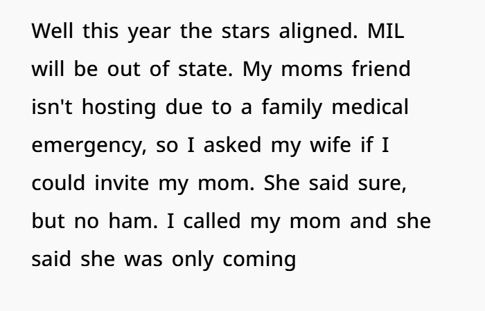 In this story, a husband asks his wife if he can invite his mother for Thanksgiving dinner, but with one condition: she wants a ham, which his wife does not want to serve. After some back-and-forth, the husband decides to buy the ham himself and cook it, leading to a heated argument with his wife. Now, his wife is furious, calling him a “mama’s boy” and making the situation tense just before his mom arrives. The question is: Is the husband wrong for cooking the ham despite his wife’s objections?