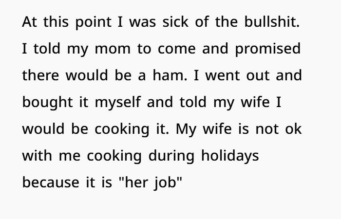 This is where things went downhill. My wife got really emotional, saying that holiday cooking was “her job” and she felt like I was disrespecting her by cooking anything during the holidays. Honestly, I was frustrated. I wasn’t disrespecting her—I was just trying to make my mom happy and keep the peace. I told her I was going to cook the ham, and that was that.