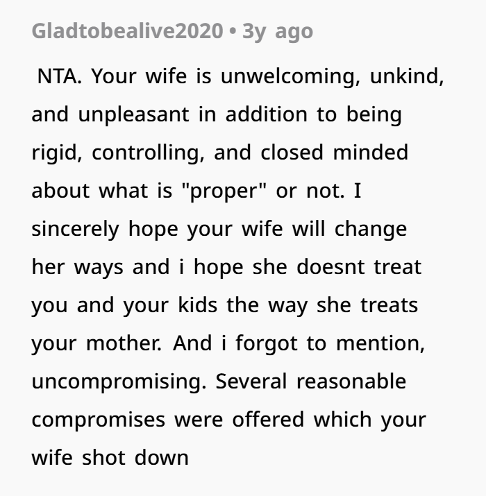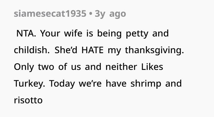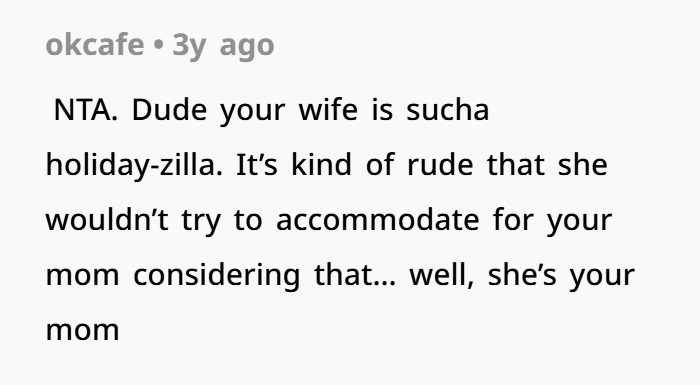A man’s wife agreed to invite his mom for Thanksgiving, yet refused to include her favorite meal