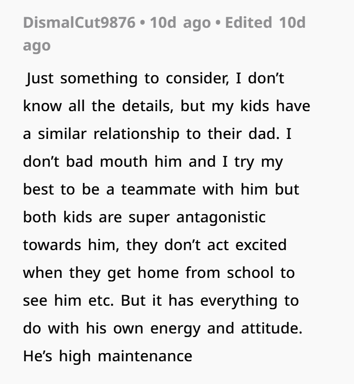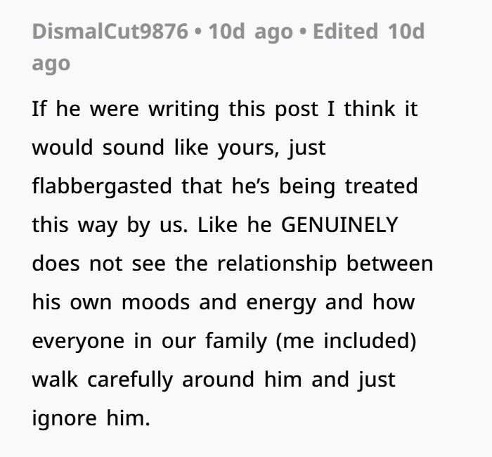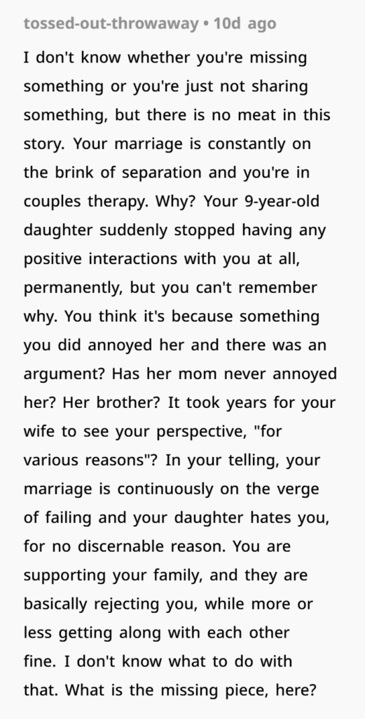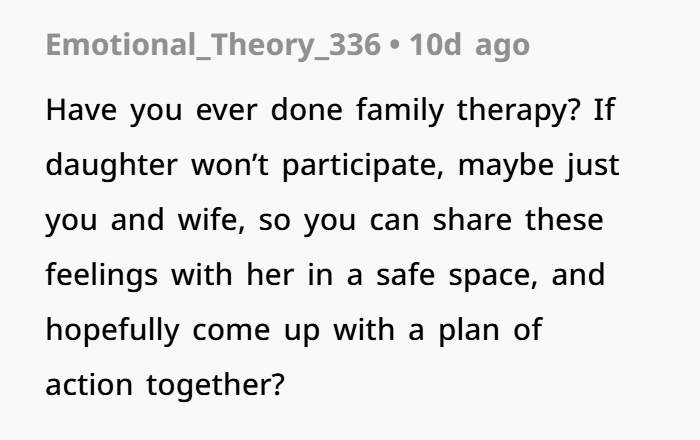 There’s another layer to this: male mental health. A lot of men suffer silently. Society teaches guys to “tough it out” or “be strong,” even when they’re emotionally falling apart. This dad admitted he’s been struggling with depression and self-worth for years. And the constant barrage of coldness from his daughter, with little to no support from his spouse, only makes it worse.