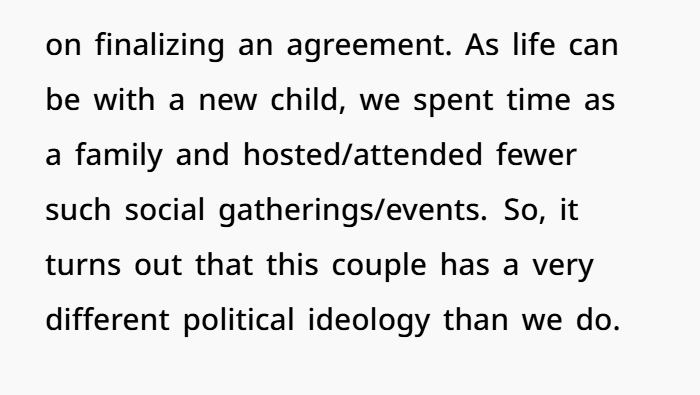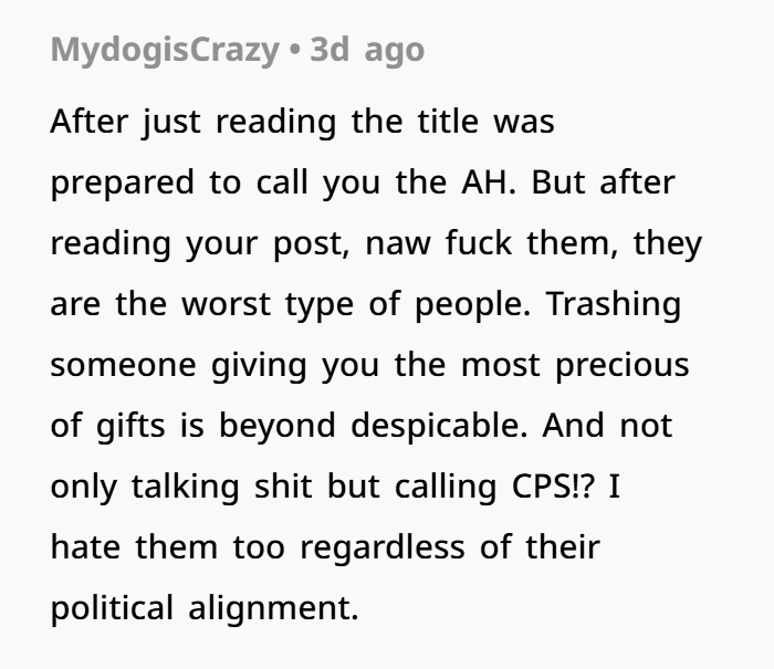 What’s really sad here is that a completely non-political, private act of kindness got caught up in ideology. But once they started telling others they were “glad to never see you again” and trashing you publicly—then yeah, lines were crossed.