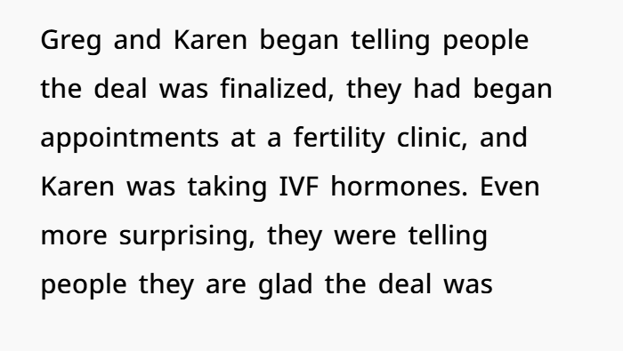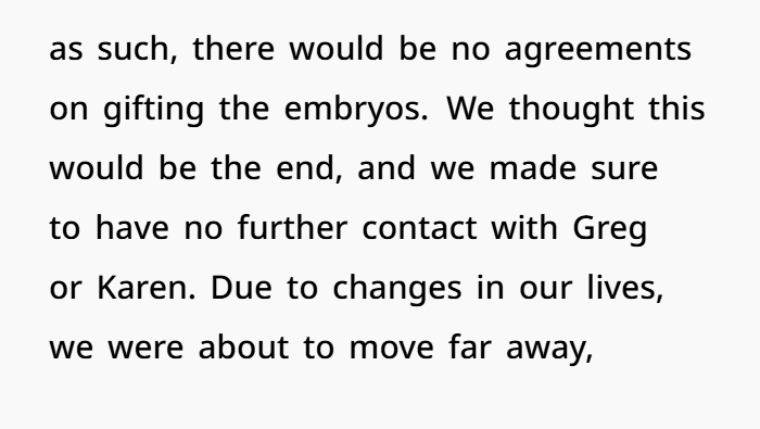 It all started with the best intentions. Nothing was signed, no formal agreement made—just discussions about possibilities. But soon after, Greg and Karen began claiming the embryos as their own, spreading harmful rumors, and trash-talking the very people trying to help them. When friends reported that Karen even joked about calling CPS out of spite, the original couple decided to destroy the embryos. They didn’t want people like that raising a child created with their DNA.
