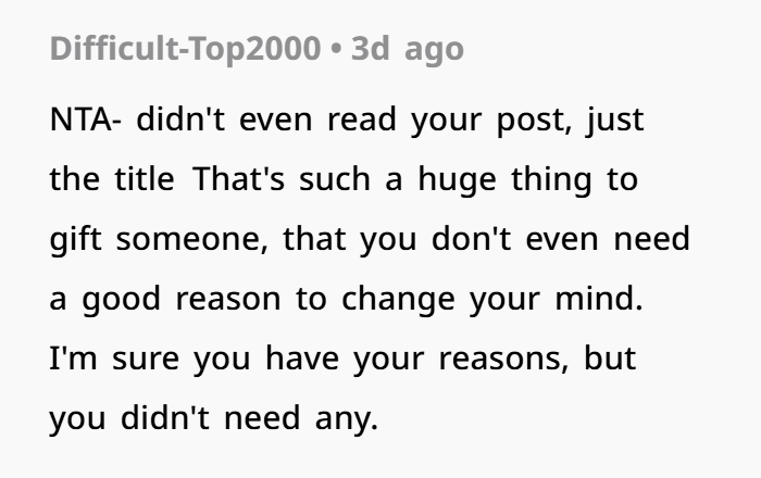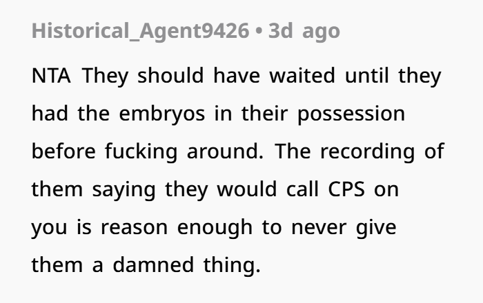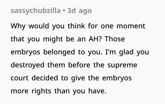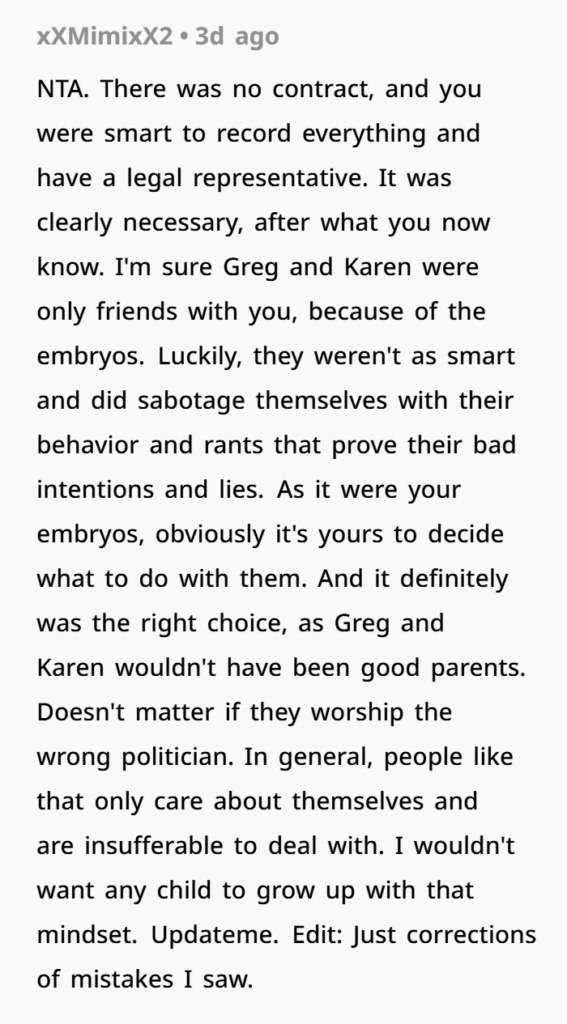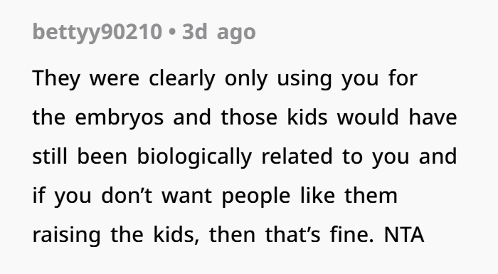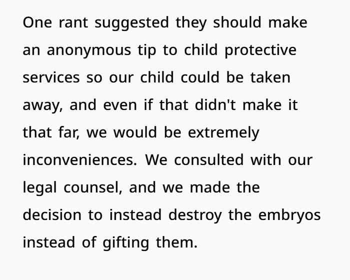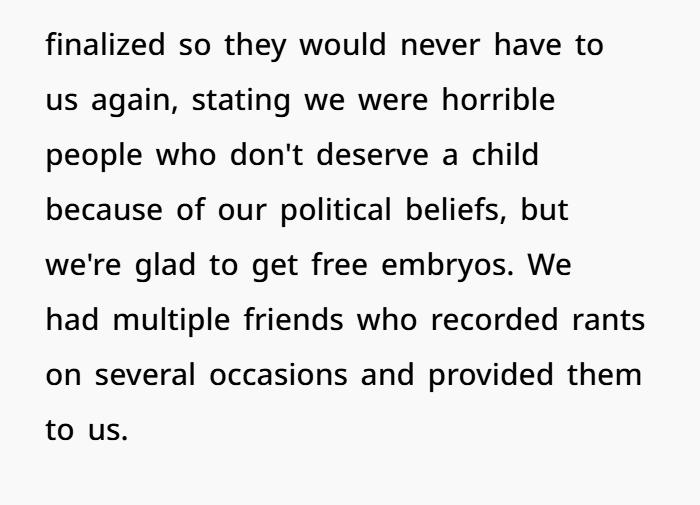 This wasn’t just a difference in opinion. This was targeted, vindictive behavior. And you weren’t just thinking about yourselves—you were thinking about the child that could come from that embryo. That’s a huge responsibility. If you feel like the couple no longer shares your values and could be unfit parents based on their behavior? It’s not just your right—it’s kind of your duty to reconsider.