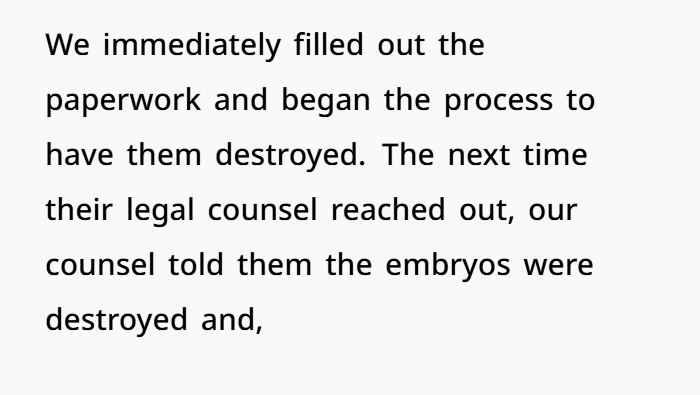 Ethically, destroying viable embryos might feel heavy. But this isn’t like tossing away food—you weren’t trying to be spiteful. You were cutting ties from a potentially toxic future. You’d already made peace with not having more kids, and you were being generous by offering them at all.