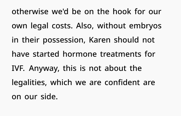 Also worth noting: clinics won’t release embryos unless all parties sign off. So the idea that Karen was already doing hormone treatments assuming it was all locked in? Wildly irresponsible—and her fertility doc likely dropped the ball if that was really happening.