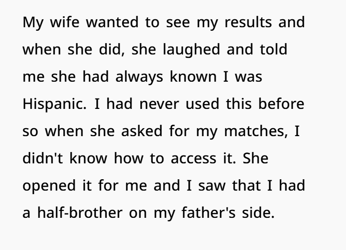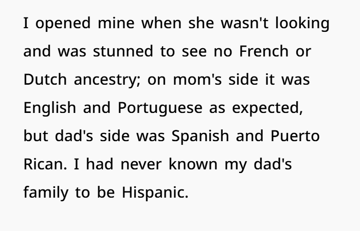 When a man and his wife casually submitted their DNA to Ancestry, he never expected the results would unravel the very foundation of his identity. Raised believing he was French, Dutch, Portuguese, and Swedish, he had brushed off years of people joking he looked “too brown” compared to his siblings. His wife, curious about their ethnic backgrounds, nudged him into the test—and what came back wasn’t just surprising, it was life-altering. There was no French or Dutch in sight. Instead, his paternal side came up Spanish and Puerto Rican, along with a DNA match to a half-brother he never knew existed.