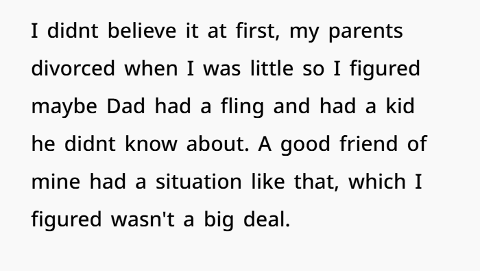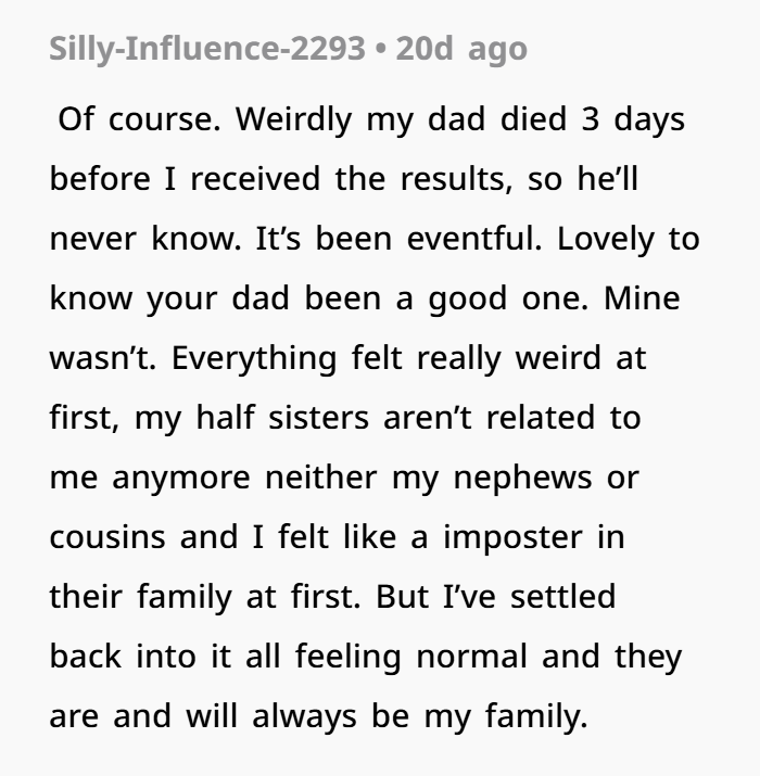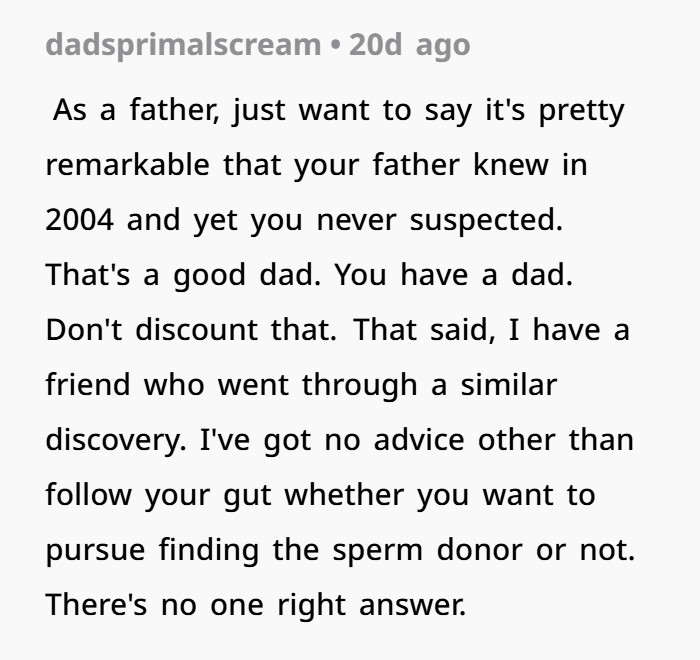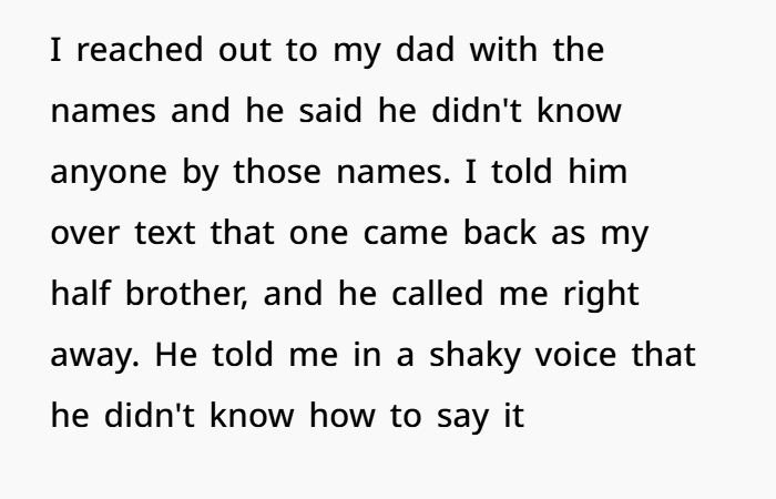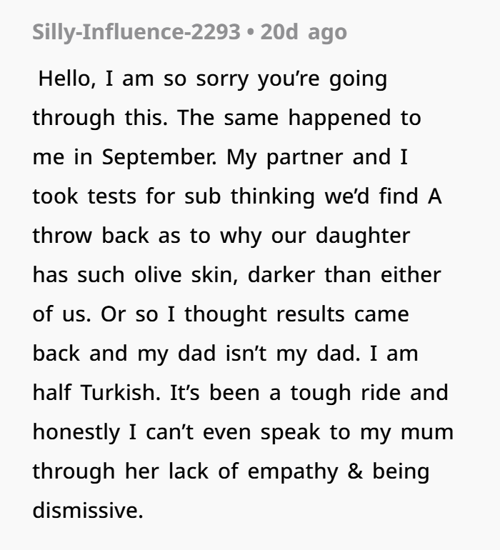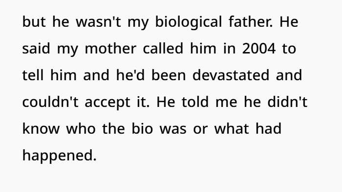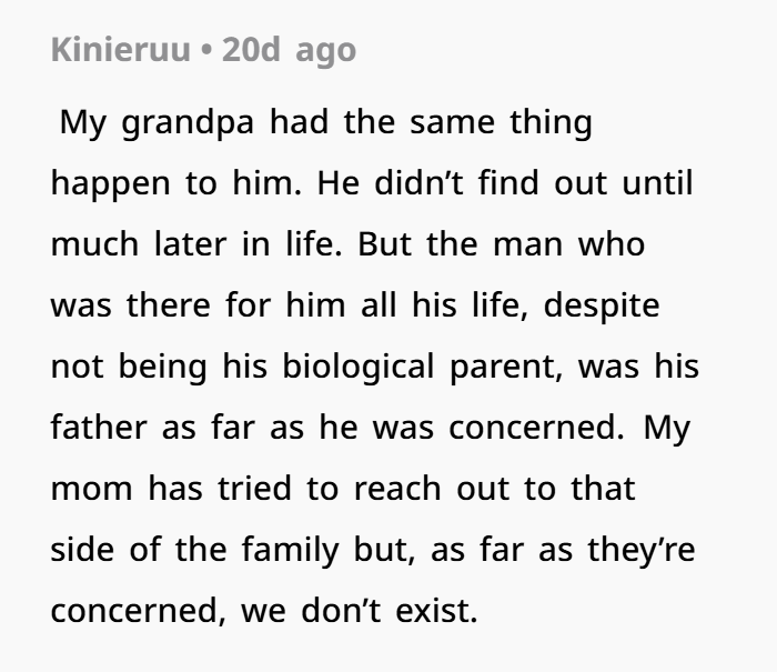 What’s really heartbreaking is how it changes your relationship with your parents. Finding out that the man who raised you isn’t your biological father is a kind of grief that doesn’t have a name. You don’t just lose a version of your past—you lose trust. His dad, in this story, only found out the truth in 2004 and kept it to himself. That’s over 15 years of silence. Imagine the emotional toll of holding that in. And the mom? Her reaction was more of a shrug and avoidance. She couldn’t—or wouldn’t—talk about it.