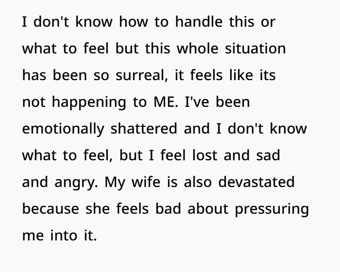 But what about the emotional wreckage? The wife, who originally joked about getting DNA kits, now feels guilty for pushing him into it. That’s understandable, but also not her fault. This was a truth waiting to be uncovered. And the husband? He’s grieving. He said it himself—it feels surreal, like it’s happening to someone else. That’s disassociation, a common trauma response.