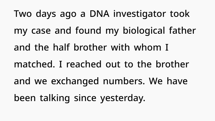 That was just the start. After confronting both parents, he discovered his father wasn’t his biological dad and that his mother couldn’t (or wouldn’t) clearly explain what happened. The emotional rollercoaster led him to connect with his newfound brother and eventually his bio father—each layer of the story more surreal than the last. With support from his wife, close friends, and a DNA investigator, he’s trying to piece together not just the puzzle of his heritage but also the fractured emotional landscape left behind by a truth hidden for decades.