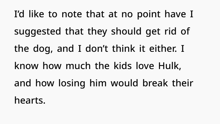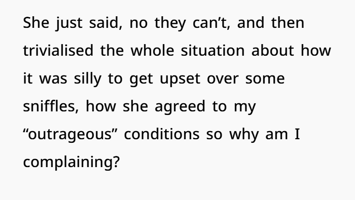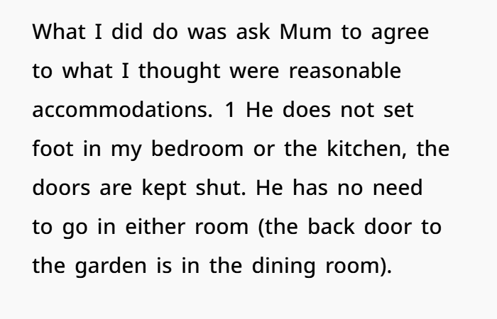 She didn’t demand the dog be rehomed. She just wanted basic boundaries: keep the dog out of her room, and out of the kitchen and bathroom. Honestly? Super reasonable. But they were ignored. Over and over. And that’s the kicker — when people make you feel like your discomfort doesn’t matter, you start feeling invisible.