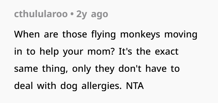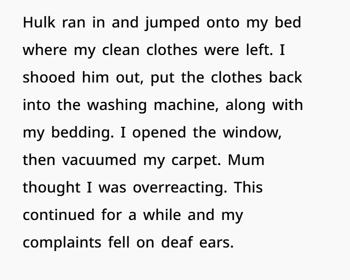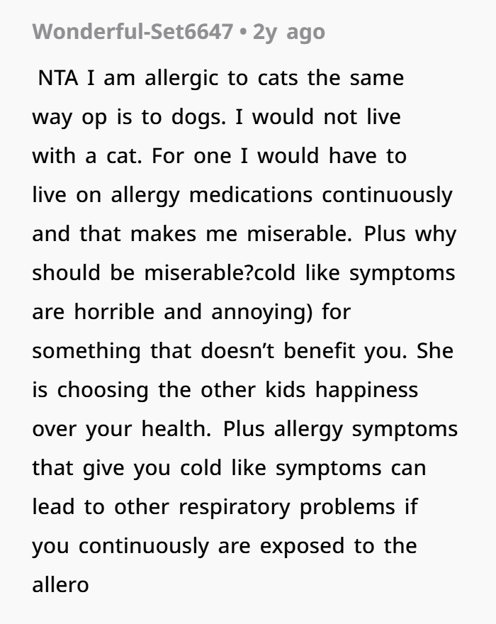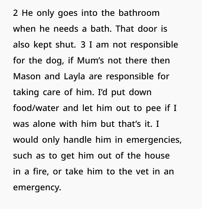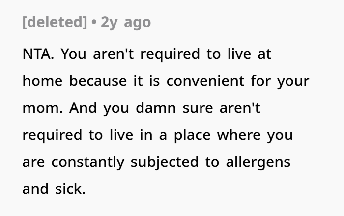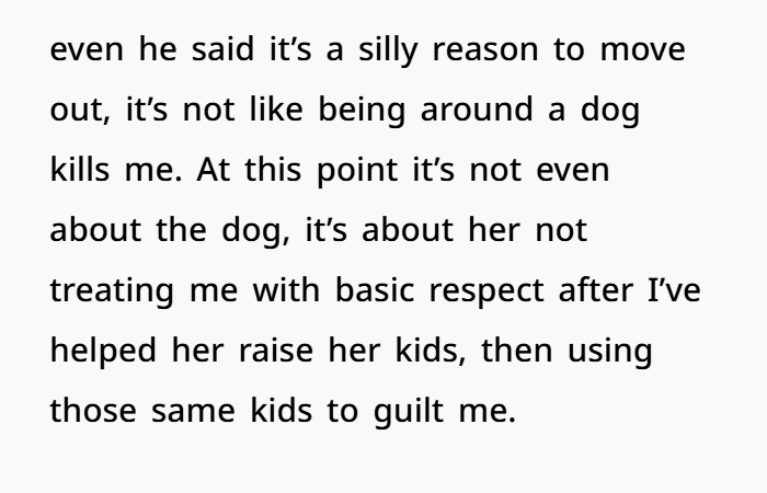 But then things changed. Her mum brought in a dog — without warning — despite knowing her daughter had dog allergies. While the allergies aren’t deadly, they do make her miserable, and she had a few simple rules to try and manage the situation. But her requests weren’t respected. Her room was no longer a safe space, the dog kept getting in, and her mum (and the kids) repeatedly broke the boundaries. After enough ignored warnings, she moved out. Now her family’s furious, calling her selfish and accusing her of abandoning the kids. But was she really the one in the wrong?