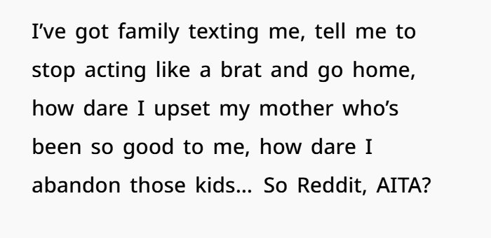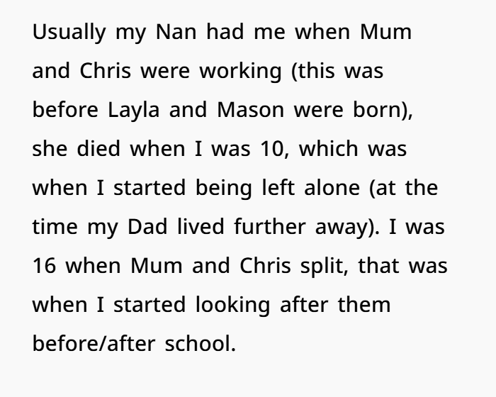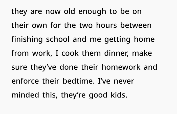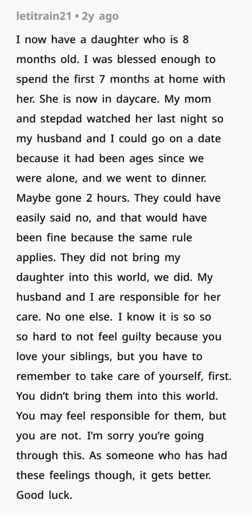 But here’s the truth: your kids are your responsibility, not your older child’s. She didn’t have those kids. She wasn’t asked. She stepped up. And her reward for that was having her comfort dismissed and her help taken for granted.