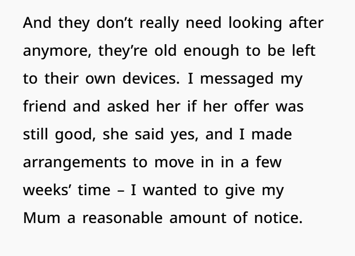 Okay, could she have sat her mum down and had one last heart-to-heart before leaving? Maybe. Could she have given more than a few weeks’ notice? Sure. But let’s not act like she vanished in the night. She communicated, made plans, gave her mum time to adjust. And still got hit with the emotional equivalent of a brick.
