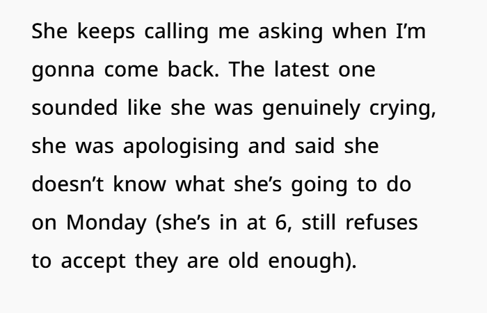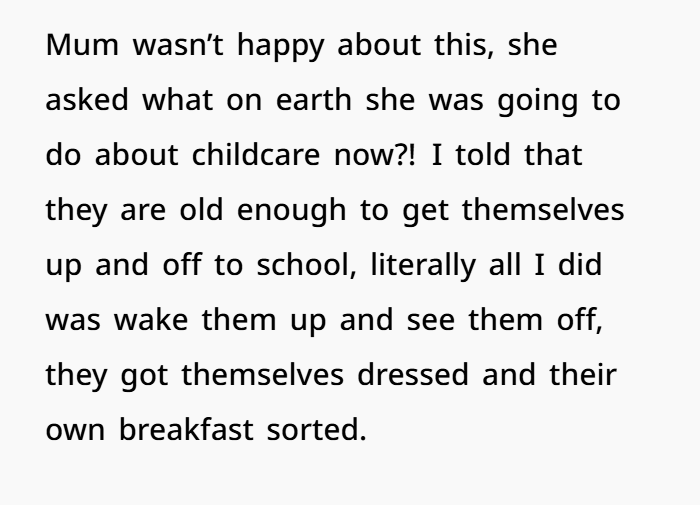 Let’s not forget: this mum isn’t evil. She’s overwhelmed. Single parenting with a rotating shift schedule is a nightmare. Childcare for shift workers is a real issue — and it’s expensive, complicated, and inconsistent. It’s no wonder she leaned on her daughter. It worked. Until it didn’t.