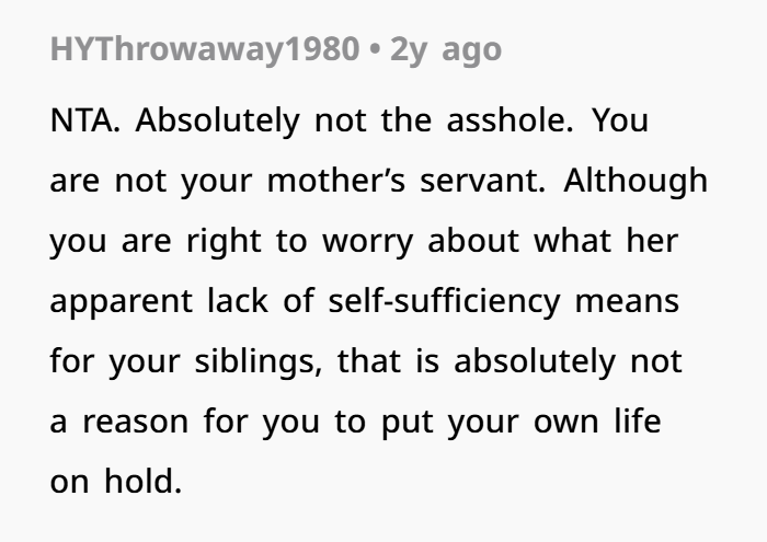 Let’s talk about toxic family expectations for a sec. There’s this unspoken rule in some families: If your mum sacrificed for you, you owe her everything. But that’s not how relationships work — especially adult ones. She did help out a lot, and yes, her mum gave her a place to live. But that doesn’t mean she has to tolerate constant boundary-crossing and emotional manipulation.