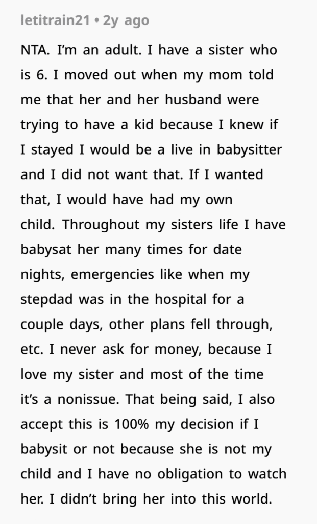 But her mother started guilt-tripping her, saying she couldn’t find anyone to help her with childcare