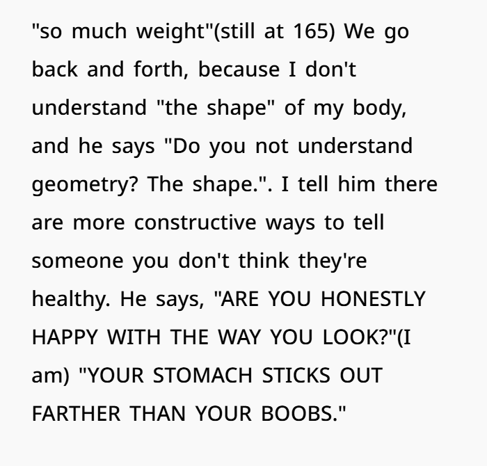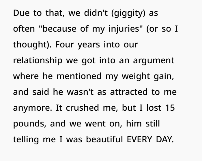 This happens more than people admit. In long-term relationships, one partner starts to see the other as “less than” because of weight gain, injury, aging, or even emotional burnout. But weight does not define worth. And if someone only wants to be with you at a certain “shape,” that’s not love — that’s conditional tolerance.